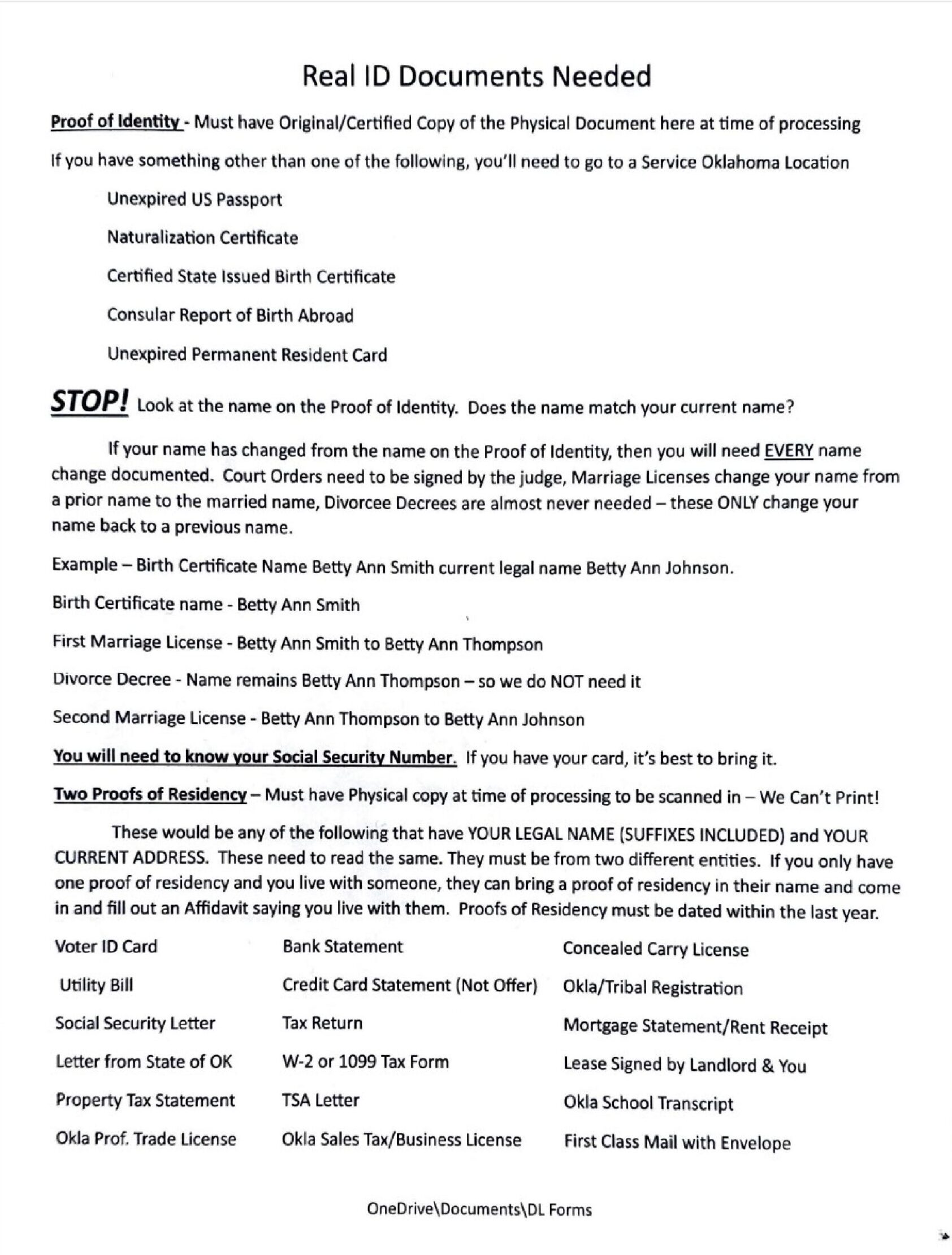 This is our provided document checklist, you can also find it throughout our “DL/Real ID” page. Also, if you come and visit our facility there is a large poster on the wall of all the documents and several sheets on the counter for your viewing.